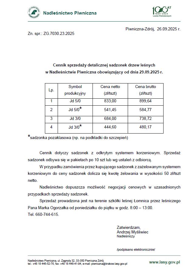 Cennik detaliczny sadzonek drzew leśnych